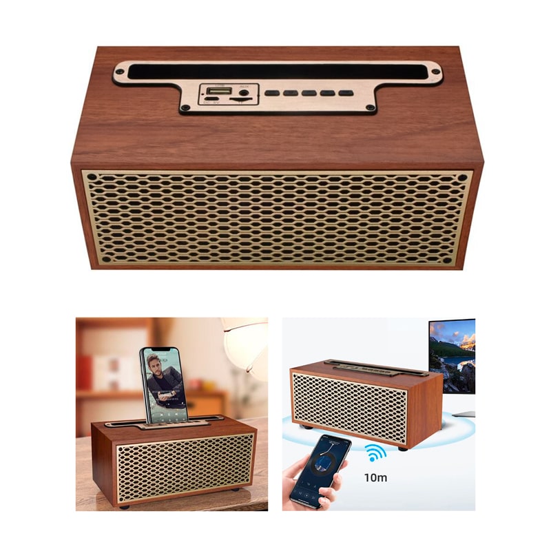 XM-5H wireless Bluetooth speaker in vintage style with radio and call answering, brown wood grain cabinet, Hi-Fi sound quality and surround bass
