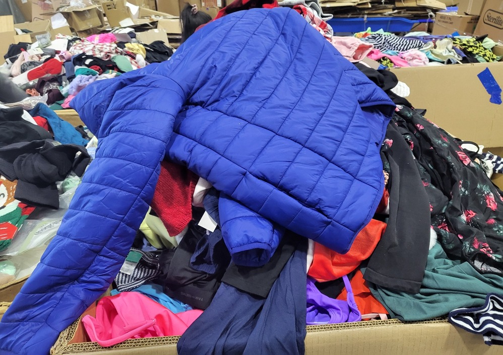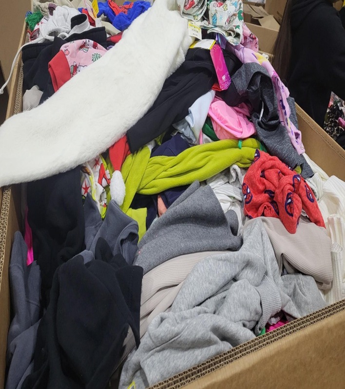 The mix includes men's, women's, and children's clothing, covering a range of seasons.